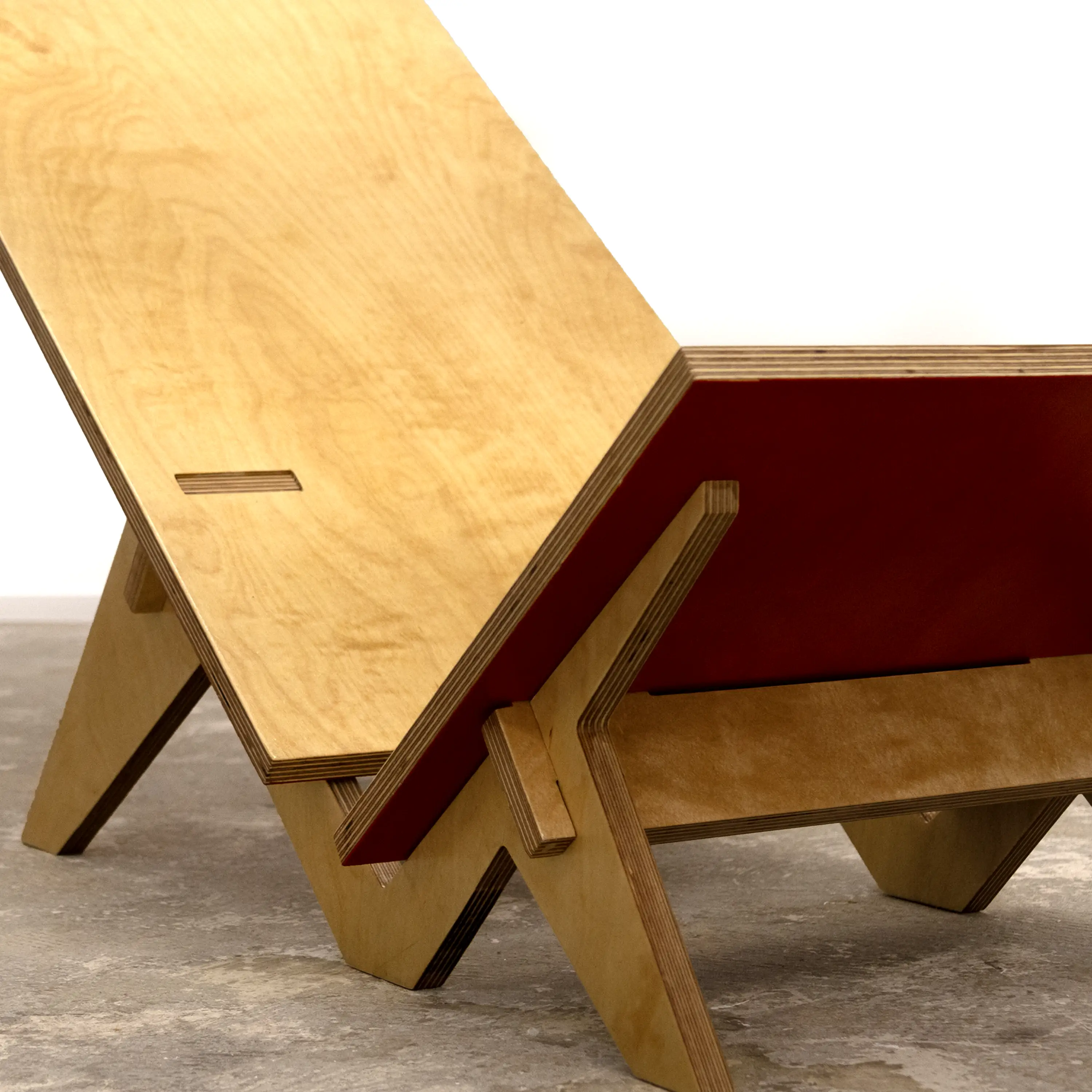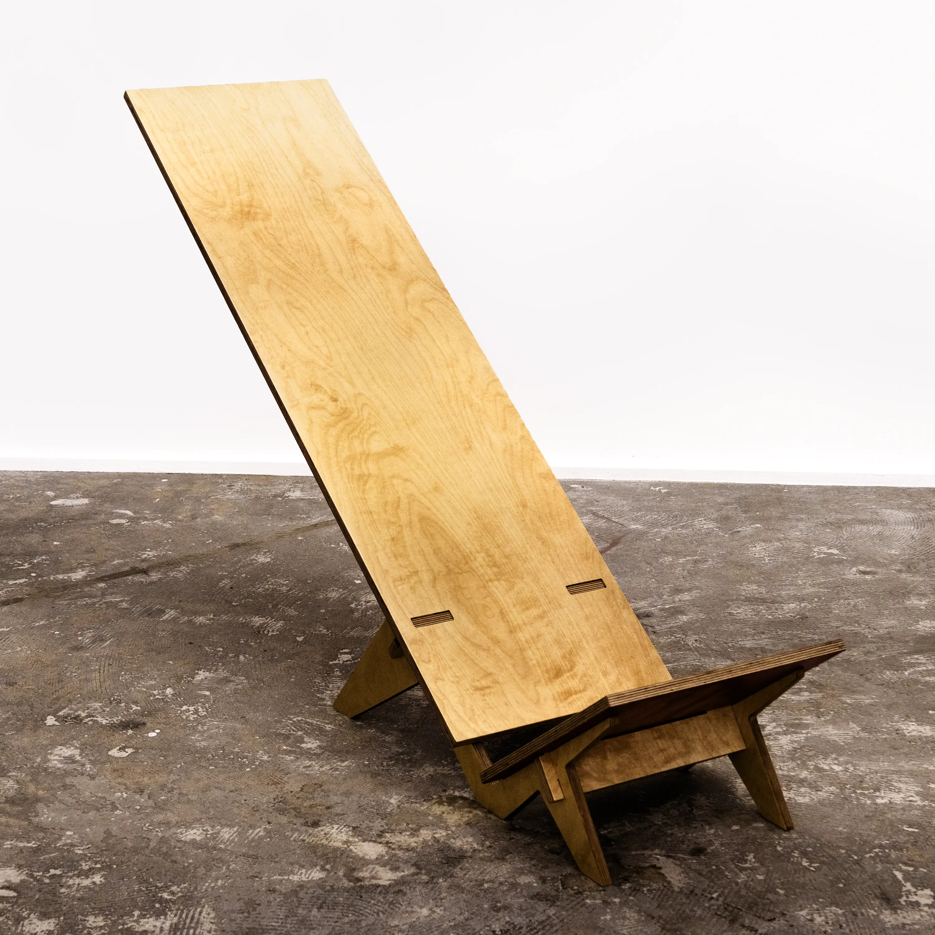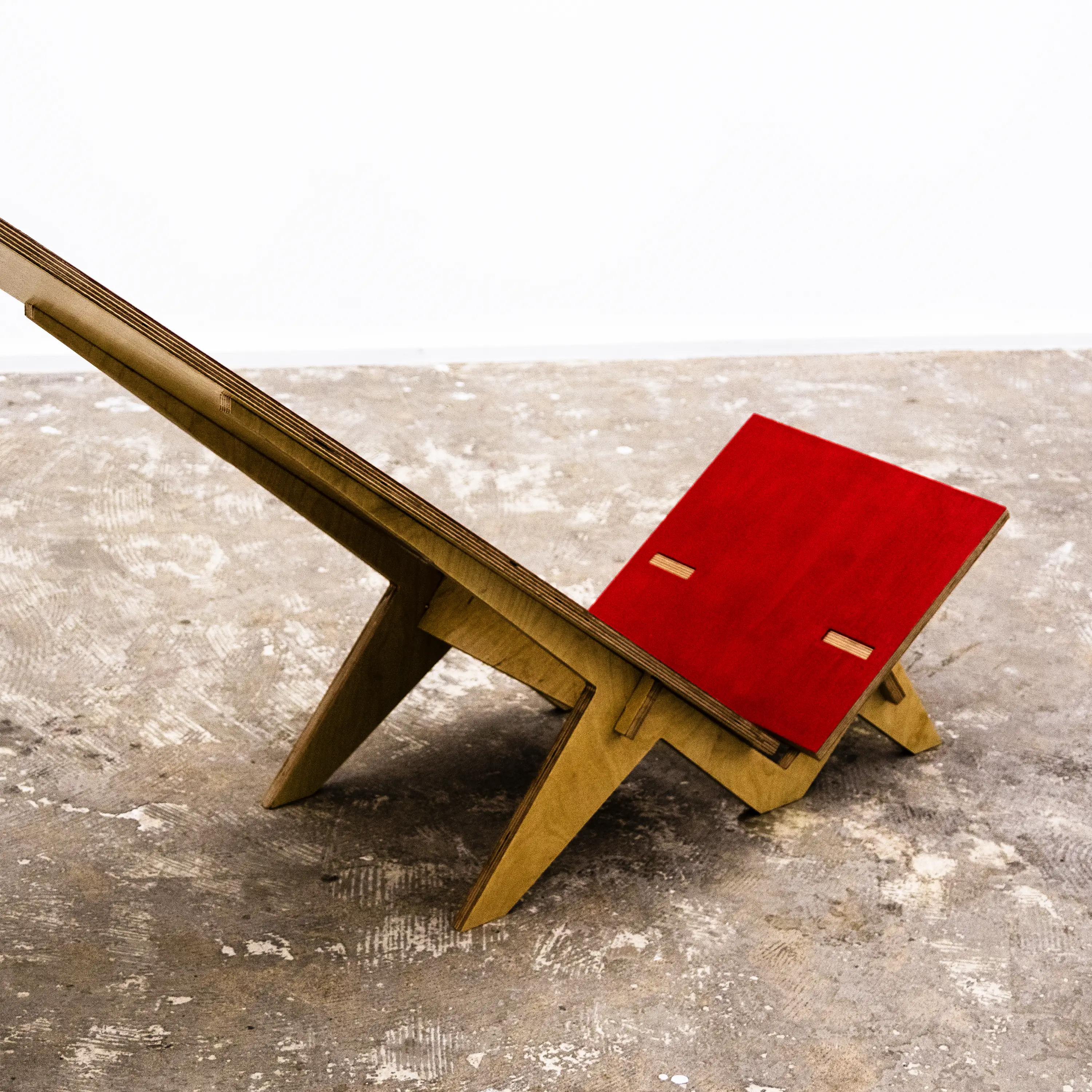 N28 is a research project focused on low to the ground seating. Its tilt is specifically designed to orient the user toward the ceiling, offering a moment of pure silence and reflection. Its shape is inspired by Palaver chairs, featuring a short seat and a particularly long backrest. Made entirely of 15mm plywood, this chair like Ntable, requires no nails, screws, or glue to be built. It is therefore mono-material, easy to produce, and simple for anyone to assemble. N28 is my 28th free project, created without any constraints or instructions.