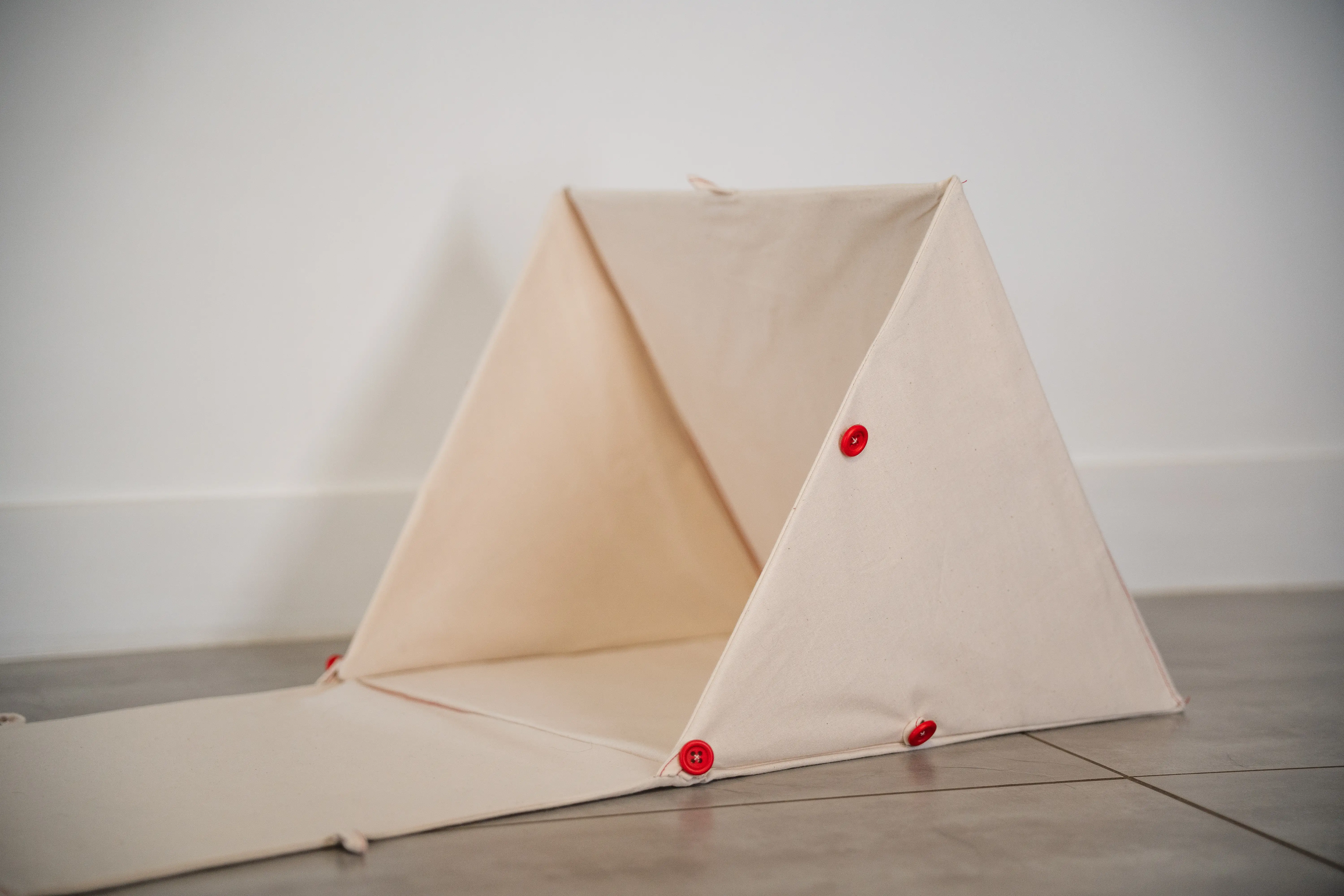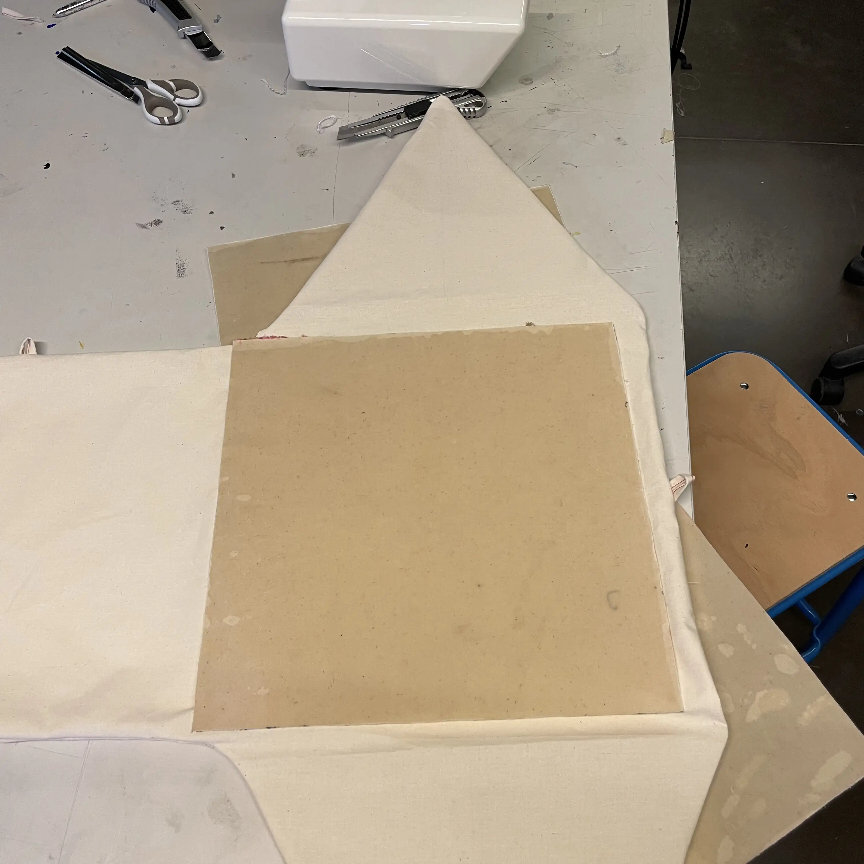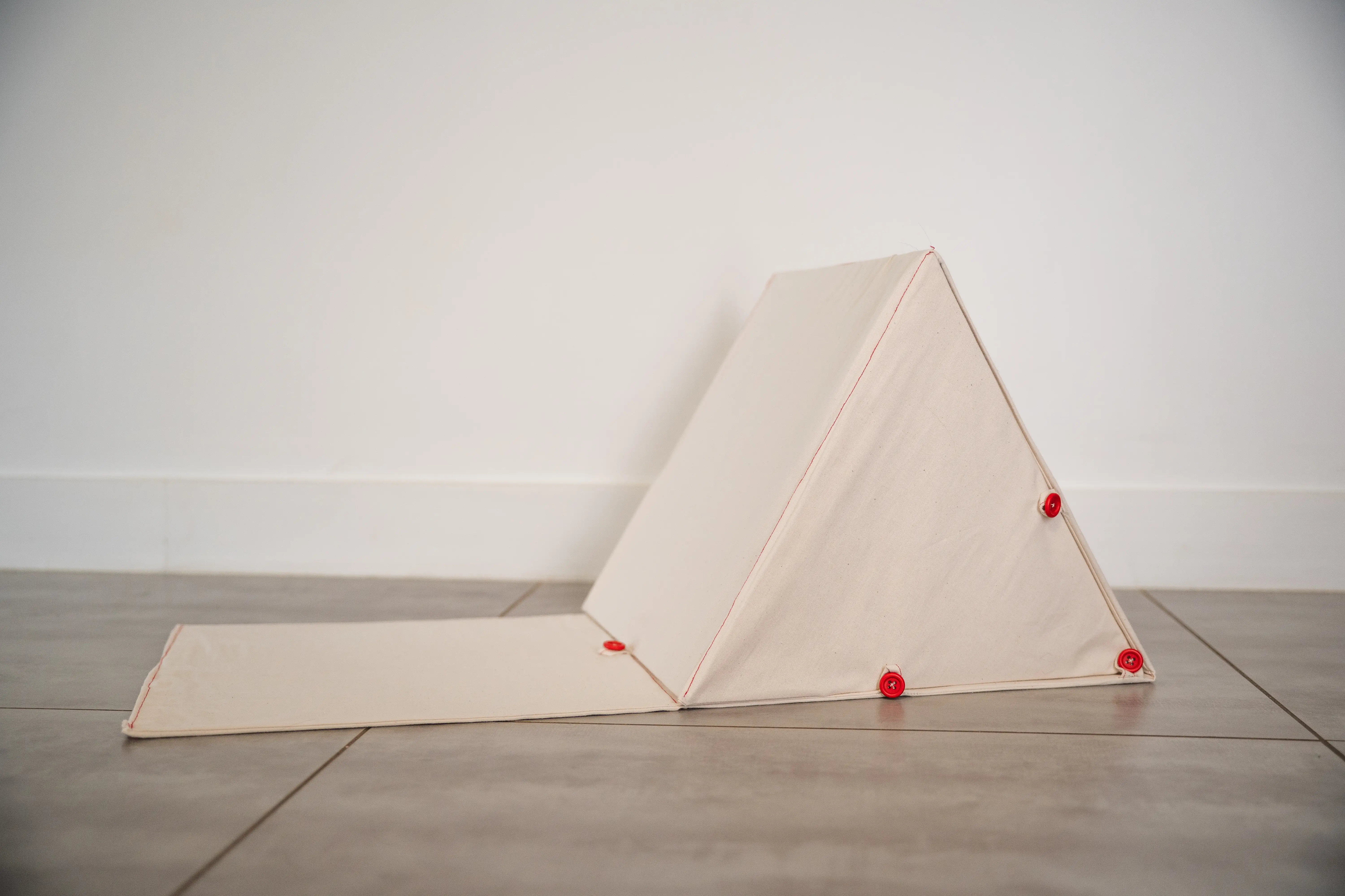 Pocket Chair is a project carried out during a textile experimentation course. I made this project with two friends, Jules Tricquet and Emma Taverna. The brief was to create an object based on the theme of “Deployment.” We came up with the idea of making a chair using resin-coated fabric. Instead of using fabric for its material qualities and flexibility, we used it as an assembly of knots; by rigidifying the base material, we created a strong, rigid panel. We therefore sewed four layers of fabric and then applied seven layers of resin. The resin-coated fabric panels were then slipped over the chair structure like a sock. It is a chair for children—a small portable playground—because once folded, it fits into a tote bag.